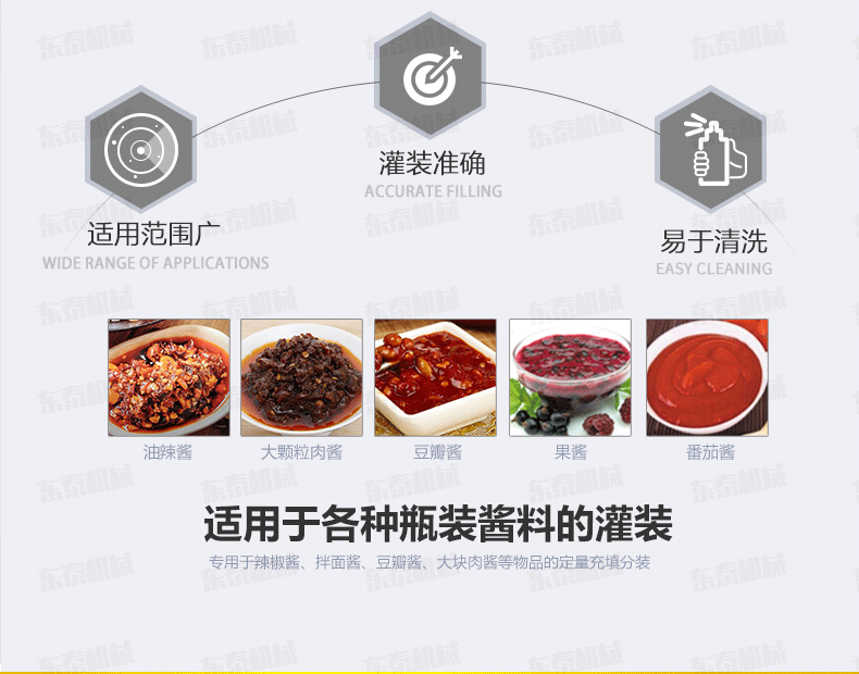 4、顆粒醬定量灌裝機(jī)主要針對食品行業(yè)的醬類分裝設(shè)計(jì)生產(chǎn),香菇醬灌裝機(jī)特別適用于調(diào)味品中帶顆粒并且濃度較大的辣椒醬、豆瓣醬、花生醬、芝麻醬、果醬、牛油火鍋底料、紅油火鍋底料等物質(zhì)的粘稠醬類的灌裝;