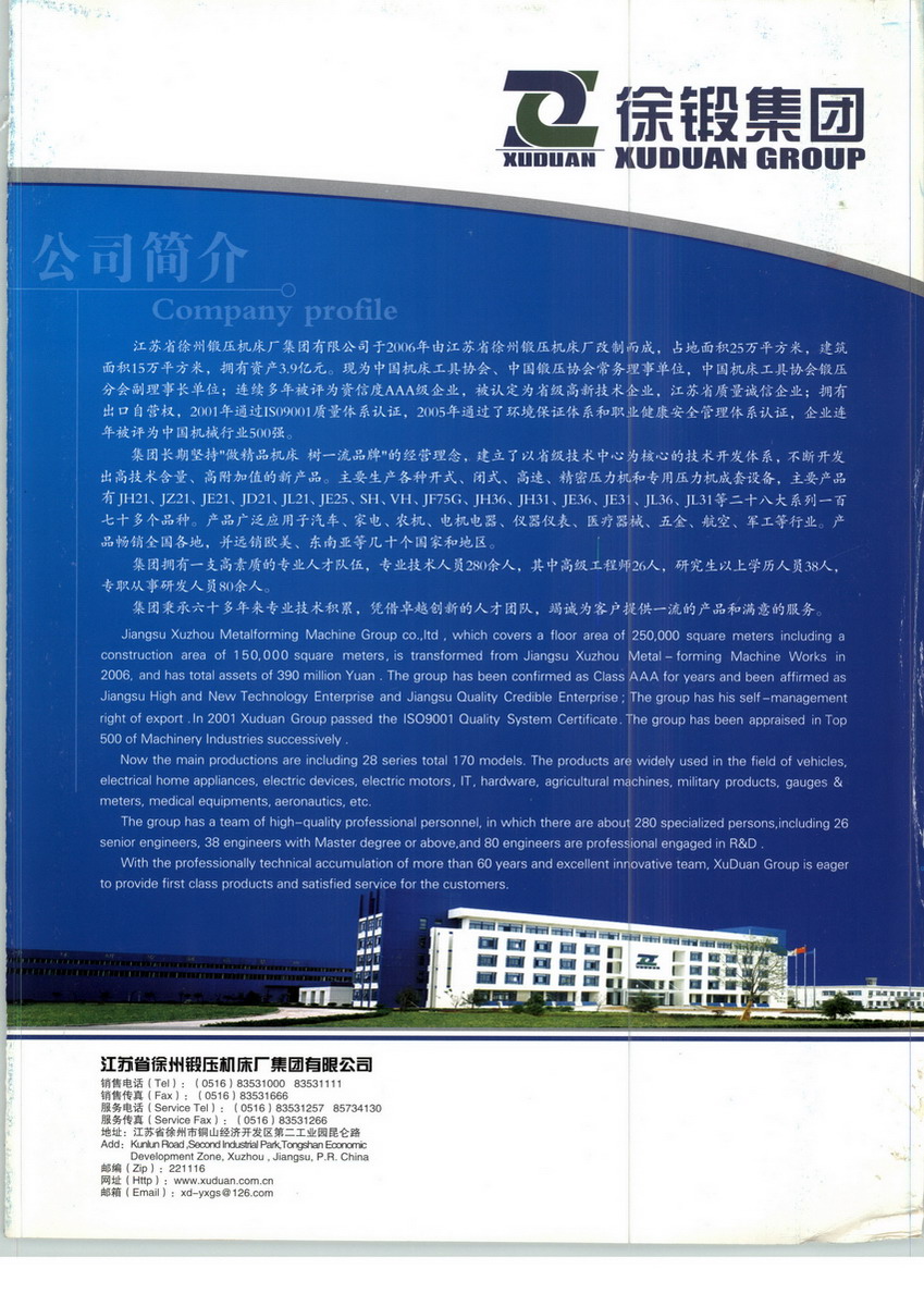 徐鍛占地面積25萬平方米,建筑面積15萬平方米;擁有資產4億元,連續多年被評為AAA級資信企業,江蘇省質量誠信企業;2001年通過ISO9001質量體系認證,2005年通過環境保證體系和職業健康安全管理體系認證;2006年被認定為省級高新技術企業;2007年被確定為江蘇省首批創新型試點企業;2010年被確定為國家火炬計劃重點高新科技企業; 2010 年我公司與華中科技大學聯合設立江蘇省企業院士工作站;2010年設立江蘇省博士后科研工作站;設有全國鍛壓機械標準化技術委員會數控高速壓力機工作組(SAC/TC220/WG1);2012年與中國礦業大學聯合設立江蘇省企業研究生工作站;2013年設立國家級博士后科研工作站,2013年被確定為江蘇省信息化與工業化示范企業,2014年與南京農業大學聯合設立江蘇省企業研究生工作站;擁有出口自營權,連年被評為中國機械行業500強企業。