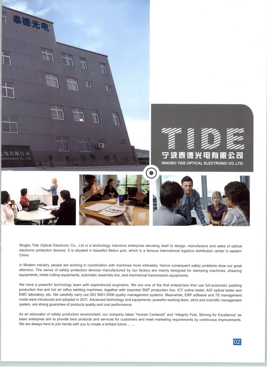 寧波泰德光電有限公司是專業從事光電保護裝置設計、生產和銷售的科技型企業,坐落于美麗的東方大港北侖,是新興的國際物流集散中心現代化的工業企業中,人與機器更加密切的協同工作,安全問題隨之更加受到重視。我司生產的安全保護裝置主要適用于沖壓機械、剪切設備、金屬切削設備、自動化裝配線、機械傳送搬運設備等。 我司擁有一支強大的科技團隊,技術精湛,經驗豐富,持續創新。我司率先在行業內引進全自動貼片生產線和完善的檢測老化設備,并擁有進口SMT生產線,ICT在線測試儀,AOI光學測試儀,EMC實驗室等。公司認真貫徹ISO9001:2008質量認證體系,2011年引進ERP軟件,并全面推行“7S”管理模式。先進的技術和設備,強大的科技團隊,嚴格的科學管理制度,是我司對高性價比產品的保證。 作為安全生產環境的維護者,我司本著“以人為本”的設計理念,“誠信第一,追求卓越”的企業宗旨,努力向客戶提供最好的產品,并通過持續改進,不斷適應和滿足市場。同時,我們爭取用最好的服務來滿足客戶,感動客戶。我司殷切希望與您一起,攜手并進,創造更美好的明天。