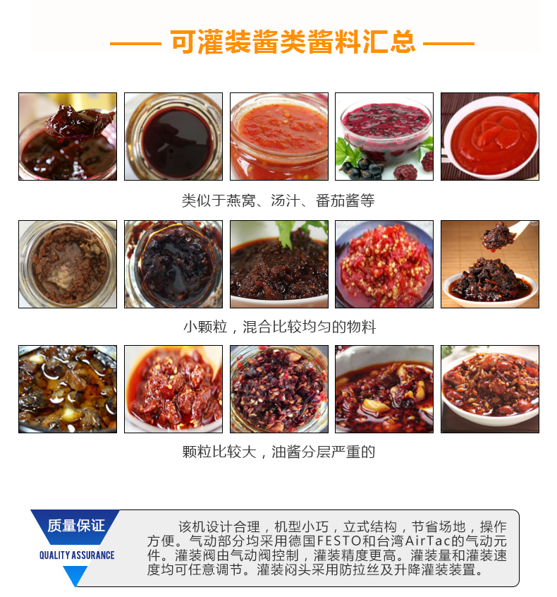 醬料行業市場日趨龐大,有非常的工作效率,來滿足客戶需求就顯的十分重要了,我們公司便能給您帶來這種的幫助,這款辣椒醬灌裝機灌裝機身為公司新生產制造的灌裝機在行業市場上發揮了重要的作用,辣椒醬灌裝機是集光,機,電,氣于一體,選用活塞式定量原理,灌裝精確度高,使用比較簡單,維護非常方便,設備主要材質:選用SUS3