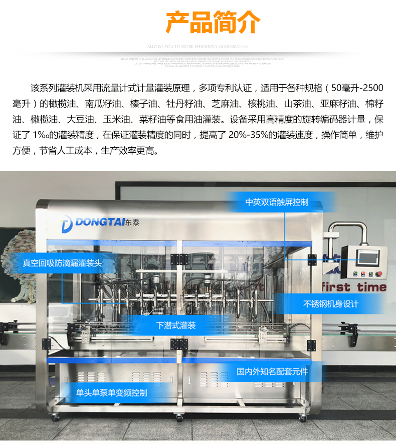 這款食用油灌裝機應用的是流量計式計量灌裝的原理,榮獲了多項認證資格,可適用各種容量(1-5升)的南瓜籽油、榛子油、牡丹籽油、芝麻油、核桃油、山茶油、亞麻籽油、棉籽油、橄欖油、大豆油、玉米油、菜籽油等多種食用油的灌裝。這個食用油選用了高精的旋轉編碼器計量,使灌裝精度保持在了1%o,在保證樂灌裝誤差的同時,提高了20%-35%的灌裝速率,使用方便,維護便捷,減少了一部分的人工成本,使生產(chǎn)效率提升。除了進桶時間,6頭灌裝機,變頻器在25赫茲的速率進行下,每組灌裝的時間為16秒,1350桶/小時;